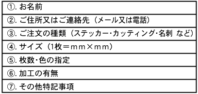 ご注文のお客様は契約事項を必読、承諾の上、下記の事項をメールにてご連絡ください。デザイン持込のお客様や打合せが必要なお客様も同様に内容をメールにてご連絡下さい。後日メールにて返信いたします。